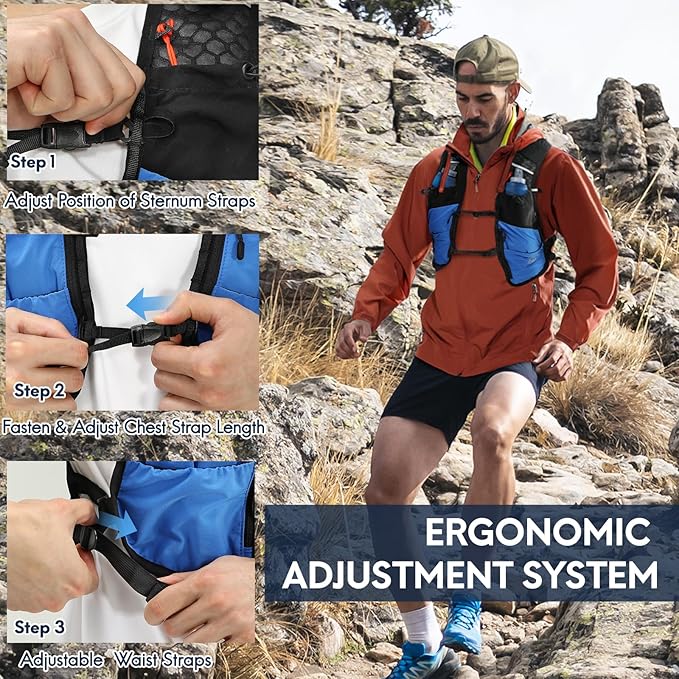 - ERGONOMIC ADJUSTMENT SYSTEM: Running vest provides an ergonomic adjustment system that allows you to adjust the position of sternum straps quickly. Adjustable waist straps can adjust the tightness according to different body shapes. This flexible design keeps runners breathing freely and moving without restraint during exercise