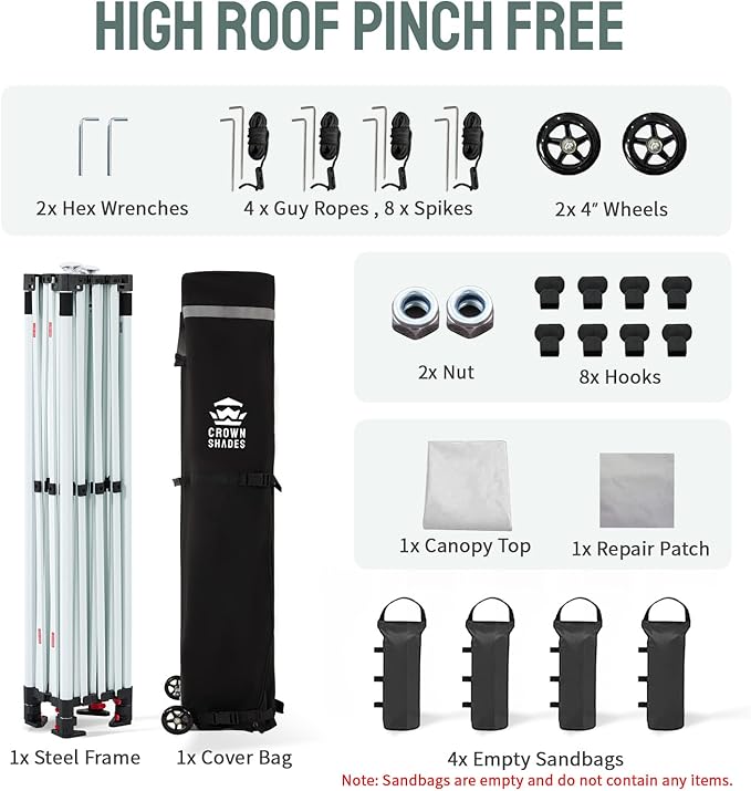 - CONVENIENT ROLLER BAG: This 10x15 pop-up canopy comes with a bag that has 4-inch wheels for easy mobility, featuring a spacious opening and a sturdy pull handle. The convenient pocket design can store 4 stakes and 4 ropes, making this canopy an ideal choice for any outdoor event.