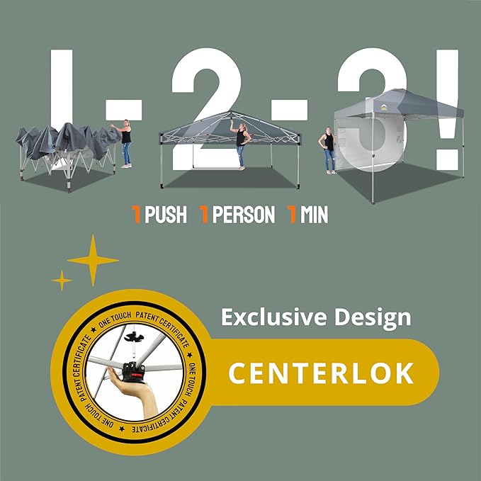- ONE BUTTON EASY SET UP - Our 10x10 pop up canopy tent features patented one push center lock tech. With just a single push, the central hub locks the poles in place. Designed for the next generation, this outdoor canopy for patio can be set up by two people in seconds without any tools. Three adjustable height settings with soft, pinch-free buttons ensure convenience and safety, making it perfect for camping, beach outings, craft fairs, tailgating, farmer markets, outdoor BBQs, and more