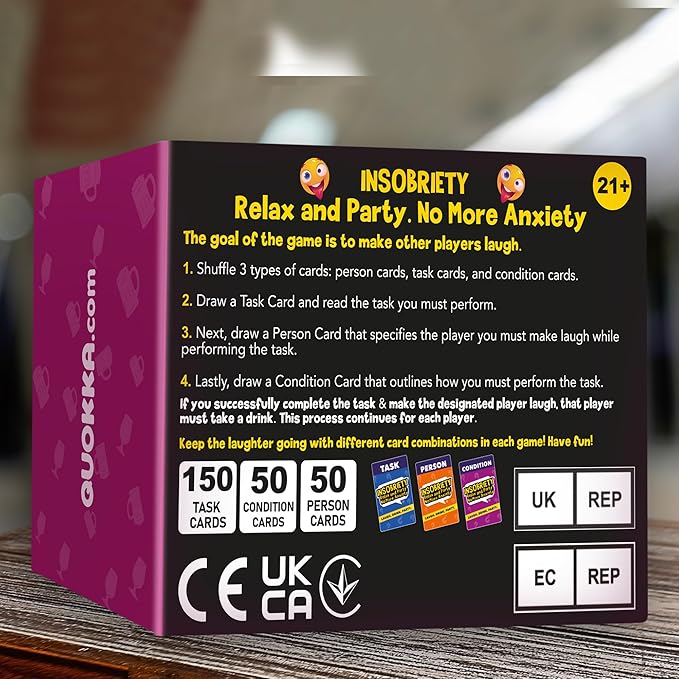 - PERFECT FOR PARTY: "Insobriety" fosters camaraderie and unforgettable moments as players discover hidden talents and bond over shared laughter, making it perfect for parties, game nights, or any social gathering where humor is the main event