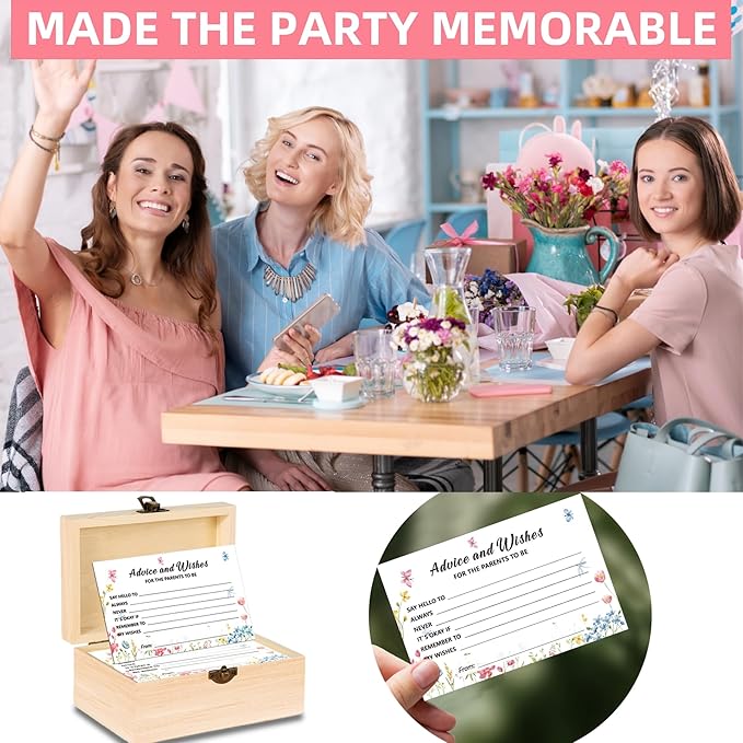 - Comprehensive Set: This set includes a wishes box along with 50 double-sided cards for baby shower games. Perfect for baby shower table decorations, these cards let your guests offer meaningful advice and wishes to the parents-to-be.