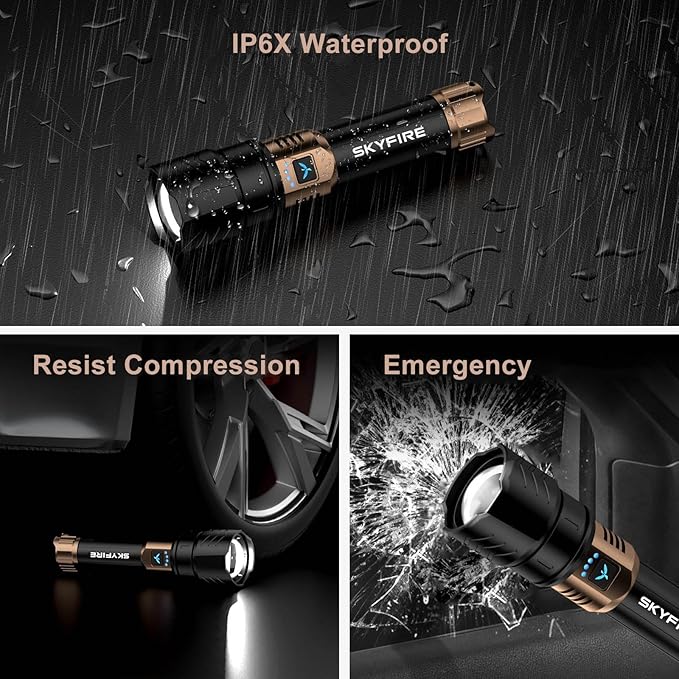 - 【Durable,Waterproof & Portable】Made from high-quality aluminum alloy, the SKYFIRE flashlight withstands drops from up to 1.2 meters and is waterproof IP67.It features a built-in emergency tool and comes with a convenient lanyard for easy carrying, making it reliable in heavy rain and harsh conditions for both home and outdoor use