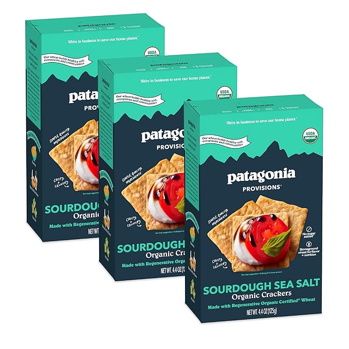 Patagonia Provisions Organic Sourdough Sea Salt Crackers (3 Pack) – 3g Plant Protein Per Serving – Made with Wheat Flour & Sea Salt – Non-GMO, No Added Sugar - Crispy & Crunchy