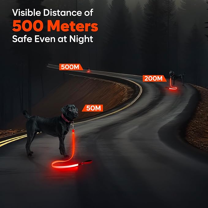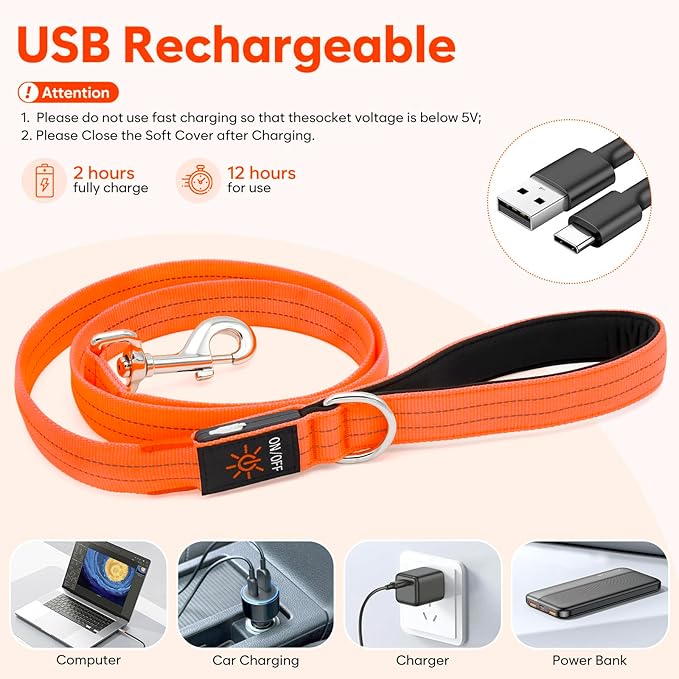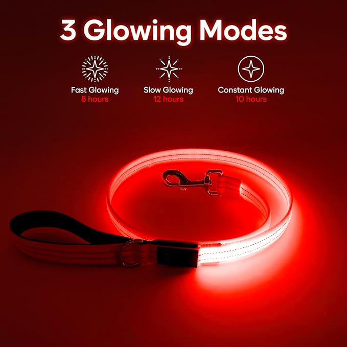- 【3 LIGHTING MODES】USB charging technology, you can charge it anywhere, and it only takes 2 hours to fully charge.Our light up dog leash have 3 light modes for you to choose, fast flashing for 8 hours, slow flashing for 12 hours, and steady glow for 4 hours.