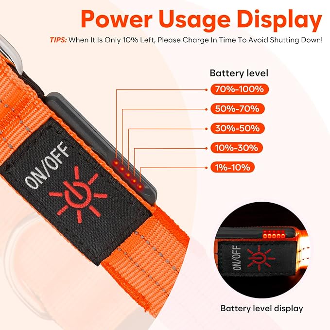 - 【USB RECHARGEABLE】The dog glow collar fully charges via USB in just 1.5 hours, and with a battery indicator to remind you to charge it in time before the power is about to run out. Attention: When there is only 1-light up, it will keep flashing until it turns off automatically!