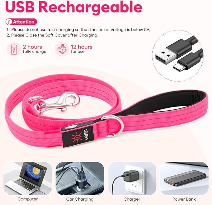 LED Dog Leash, 4 Ft Light Up, USB Rechargeable, Waterproof, Nylon Reflective with Padded Handle, Glow in The Dark for Large, Medium, Small Pets (Pink)