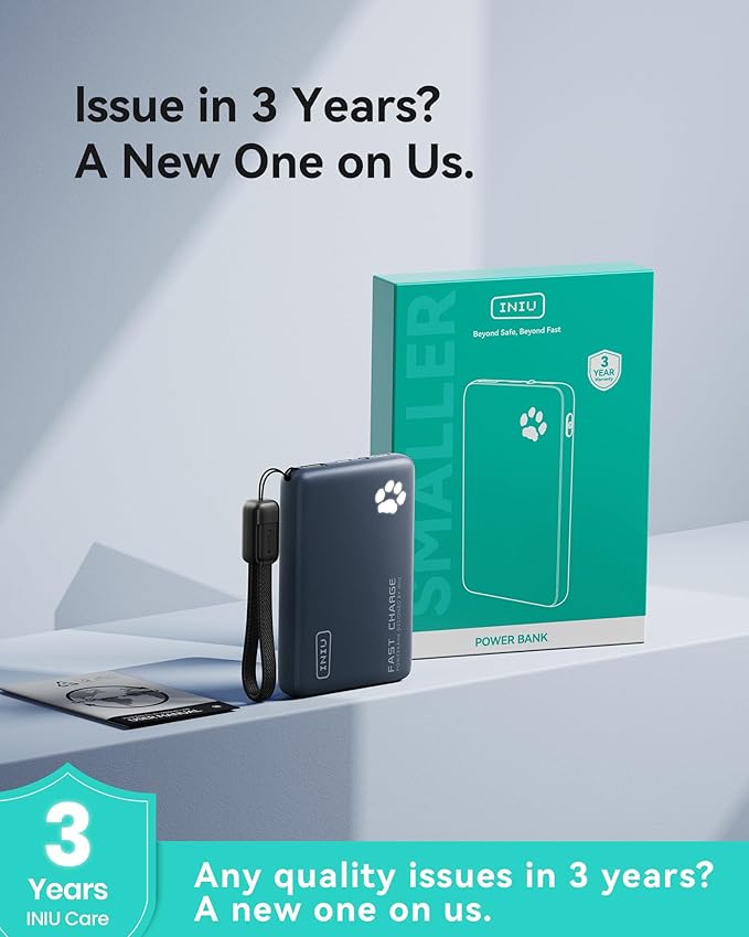 - What You Get: INIU 10000mAh portable charger*1, 0.12M/0.4ft Lanyard USB-C to USB-C Cable*1, user manual*1, and Industry-Leading 3-Year INIU Care, plus Lifetime Technical Support.