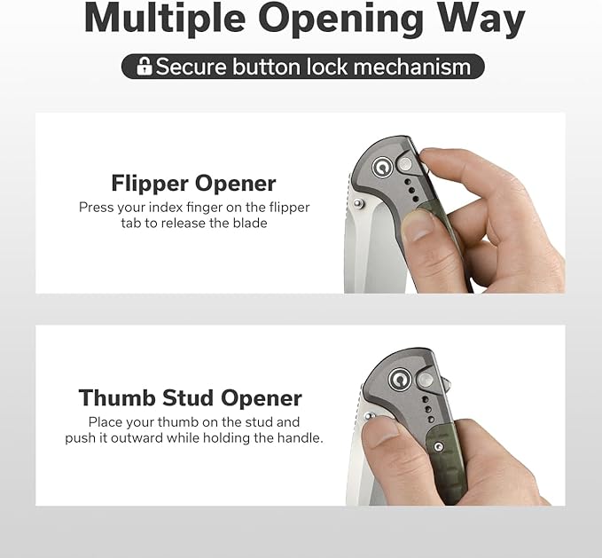 - Multiple Ways to Deploy: The flipper and thumb stud offer convenient one-handed opening, while the button lock ensures secure blade deployment