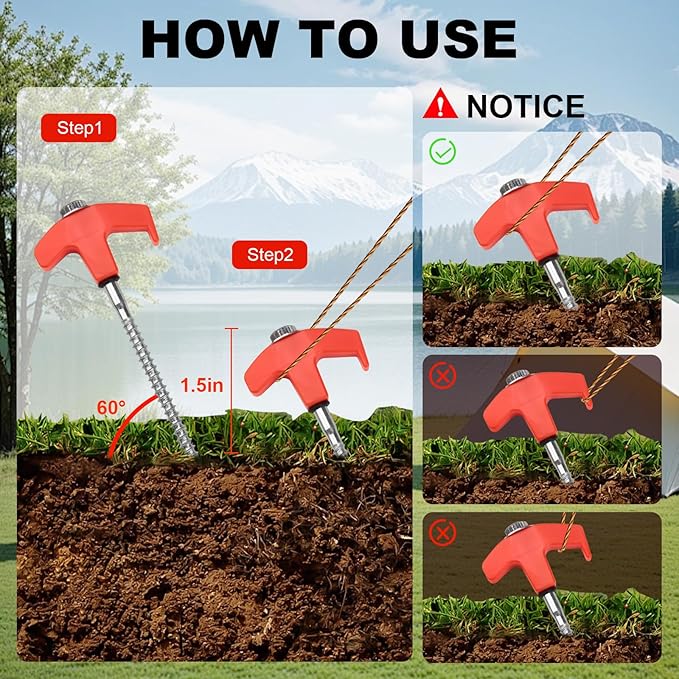 - Effortless Installation: Screw-in design allows you to spend less time setting up and more time enjoying your camping. Simply use a cordless drill or impact driver to secure your tents, canopy, awning, gazebo or tarps in seconds