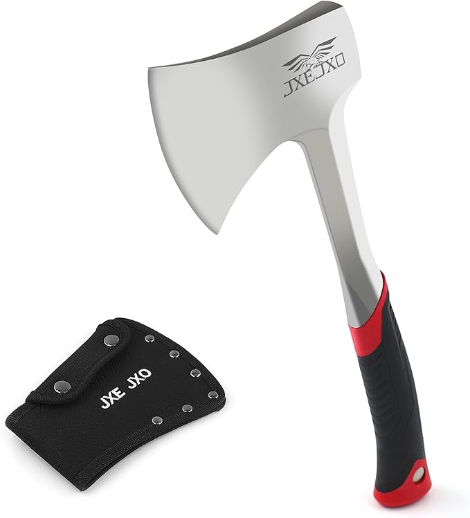 JXE JXO 14.4" Camping Hatchet with Full Tang Forged Construction & Ergonomic Shock Absorbing Grip, Hatchet Axe with Nylon Sheath (Red