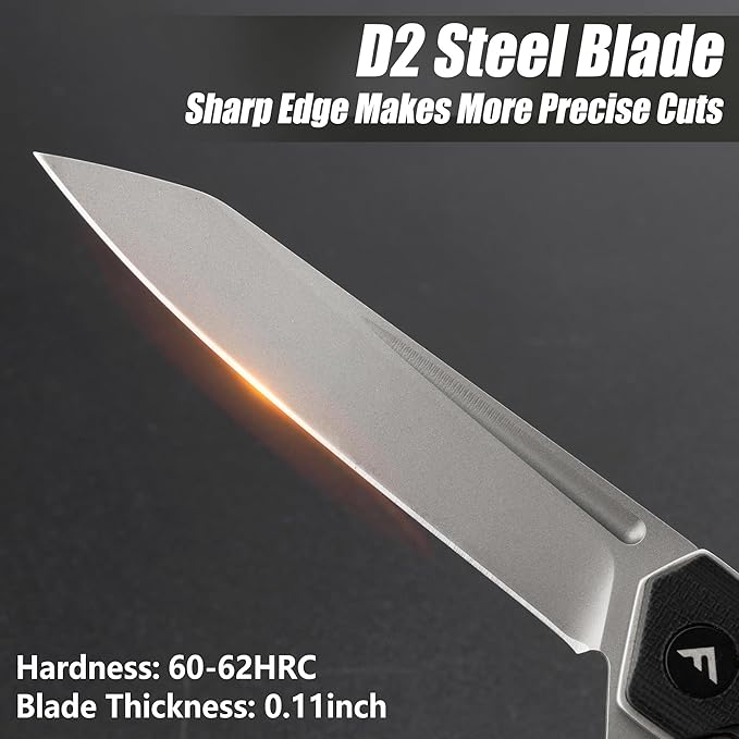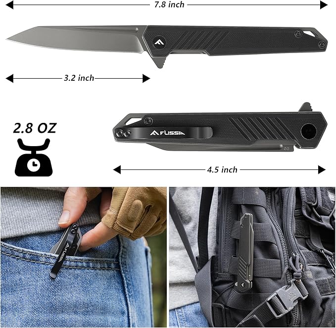 FLISSA Folding Knife, Pocket Knife with D2 Steel Blade, G10 Handle, Pocket Clip, Lightweight for Camping, Tactical, Hiking, Hunting, EDC, Daily Use, Outdoor Activities(Black)