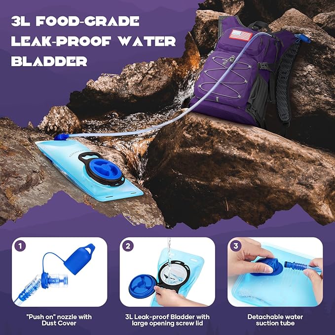- Hands-Free Leakproof Water Bladder:Stay hydrated on the go with a 2-liter bladder and bilateral hose outlets. The large opening design of the bladder ensures easy filling and cleaning. The separate insulated compartment provides hours of cooling with ice packs. The bladder is replaceable and supports up to 3 liters.