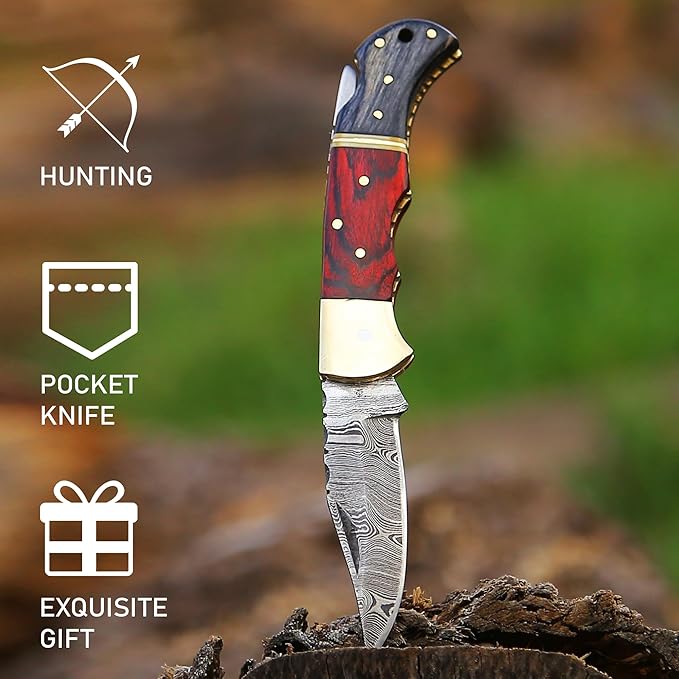 - ๐๐๐ฆ๐ฉ ๐ค๐ง๐ข๐๐ ๐ฐ๐ข๐ญ๐ก ๐๐จ๐๐ค๐๐๐๐ค ๐๐๐ฌ๐ข๐ ๐ง: The lockback mechanism in this folding Damascus pocket knife ensures the blade stays firmly in place when opened, offering enhanced safety and stability for reliable outdoor use.