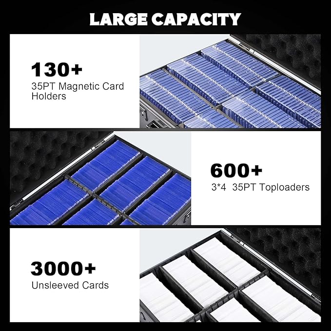 - Large Capacity: The card case works great for storing 600+ toploaders or 130+ magnetic card holders; It can also hold unsleeved cards or other card slabs; Equipped 4 card stoppers can solve the problem of a few cards to be fixed