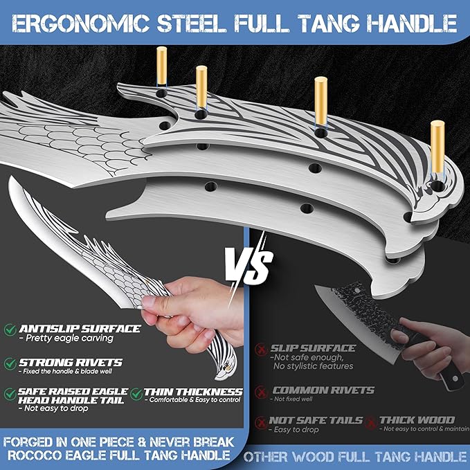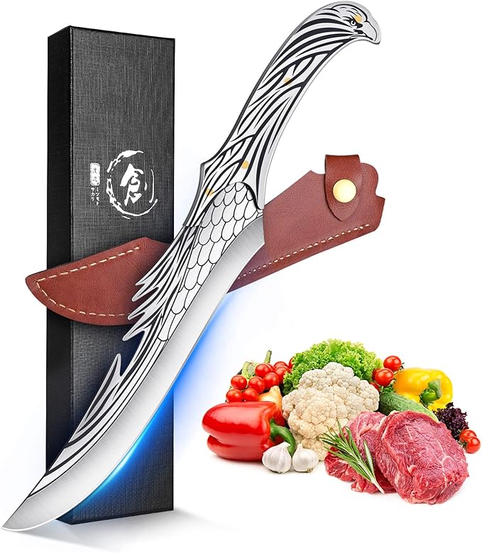 - UNIQUE FEATHER SHARP BLADE - The hand -sharpened 15° V-shaped edge provides clean and effortless cuts. The meat cutting knife is suitable for deboning, cutting, filleting, skinning, and trimming meat and vegetables. The feather pattern make the butcher cleaver knife pretty and engaging. The wavy blade tip reduce the blade weight and protects your hands well.