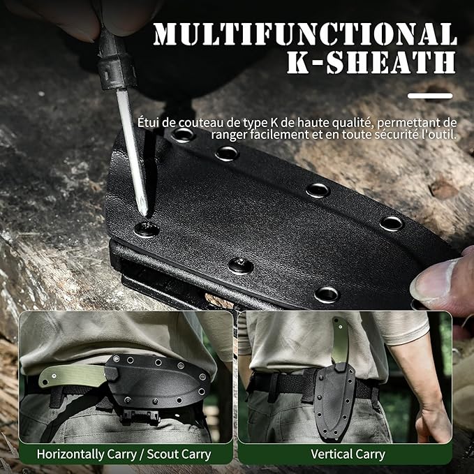 - SUPERIOR VERSATILE KYDEX SHEATH: The high-strength lightweight Kydex sheath with a universal clip can be adjusted horizontally/scout and vertically. The detachable & adjustable spacers on the clip can be used with almost any size of waist belt for easy portability.