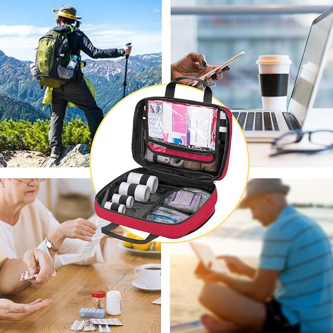 - [Excellent Storage] The main compartment has a flip cover pocket, the other mesh pockets are suitable for carrying alcohol, pills, small scissors, hemostat. Front compartment with 2 mesh pockets and slots for storing bandages, medical records, and so on.