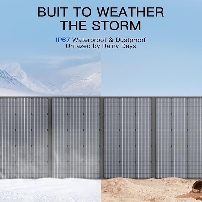 - 【Waterproof & Easy to Install】With an IP67 waterproof and dustproof, the 400 watt solar panels are made for the outdoors and can withstand the elements. The portable solar panel is equipped with professional solar system output interfaces, plug and play. The solar panel is equipped with adjustable devices. You can adjust it according to the angle of the sun in order to get the maximum output power