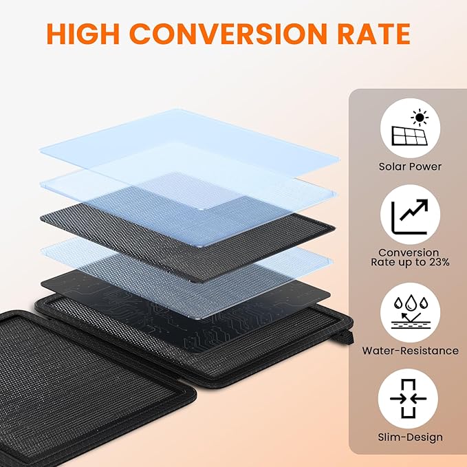 - 【Higher Conversion Efficiency】Featuring monocrystalline silicon solar cells and high-efficiency multi-layered arrays, this solar panel charger (great for usb c solar panel and usb solar panel charger setups) converts up to 23% of solar power into usable energy. Surpassing many conventional solar panels, this efficiency ensures better performance for your energy needs as a reliable solar charger.