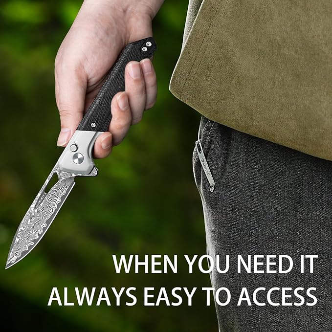 - HANDMADE DAMASCUS KNIFE: The 3.3" Damascus folding knife is meticulously handcrafted with 67-layer, resulting in a unique pattern and exceptional edge retention for precision cutting tasks. This custom knife is tailored for individuals with a discerning taste for quality.