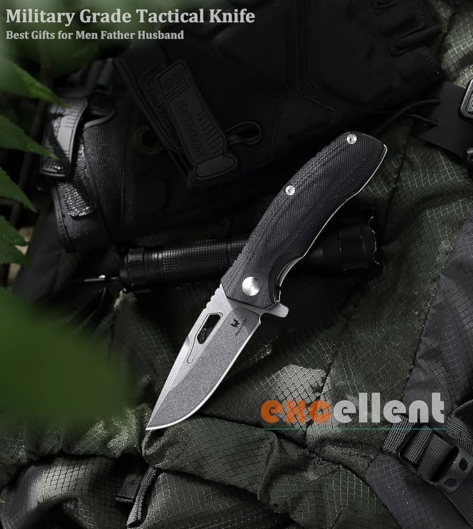 - ✅【HIGH QUALITY】- The blade is made of CPM - S35VN powder steel with a thickness of 0.14 inches (3.5 mm). Thanks to its drop point tip and V-Grind edge, it is extremely excellent in cutting performance. The premium blade steel with the stone washed process gives it strong corrosion resistance. This folding knife meets the requirements of the tactical level, can withstand strong impacts without breaking, making it very sturdy and durable. It is an excellent helper for hunting, outdoor survival and camping. It won't let you down.