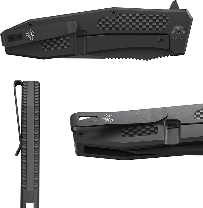 - ⚡ TITANIUM HANDLE + CARBON FIBER INLAYS: The lightweight yet ultra-durable titanium handle provides superior strength, corrosion resistance, and comfort. Enhanced with carbon fiber inlays, this design reduces weight while adding a premium, high-end look, making it a standout in both form and function. Ergonomically designed, the handle ensures a secure grip, whether for EDC or rugged outdoor use.