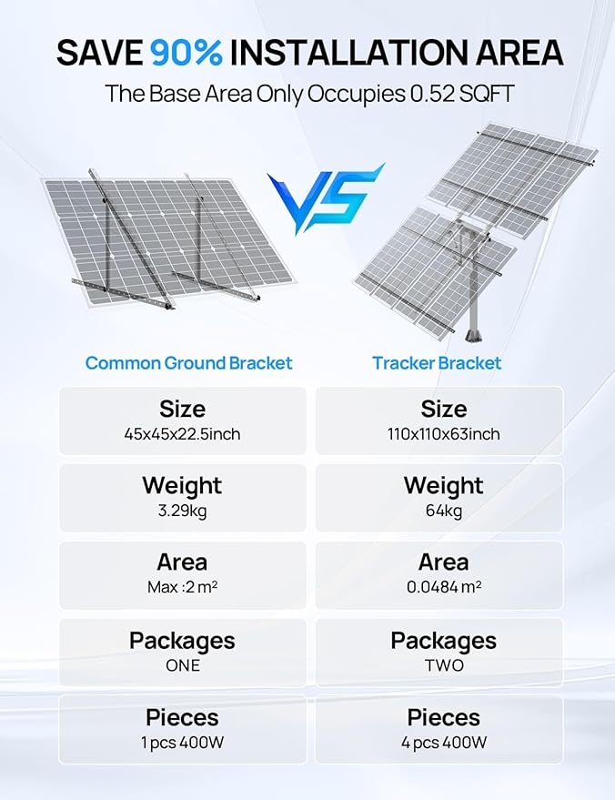 - Installation only occupies 0.0484m² area, saving 90% installation space: tracker installation only occupies 0.0484m² area, comparing with the traditional bracket to save 90% installation space, very suitable for small yard / farm installation