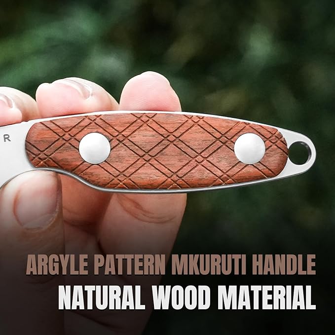 - Argyle Pattern Mkuruti Wood Handle: The wood handle material offers a combination of durability and lightweight properties; It is known for being waterproof and corrosion-resistant, making Muskrat fixed blade edc knife well-suited for use in harsh environments; Additionally, it provides an excellent grip, enhancing safety and ensuring secure handling of the camping knife