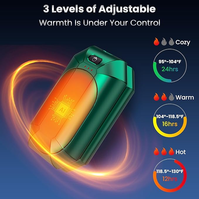 - đ„ăAI Smart Safe Heatingă: The hand warmers can be turned on by long pressing the switch for 3 seconds, and it will heat up quickly within 3 seconds. The hand warmer can be used long for 15 hours. Depending on the set temp, the use time will be different. 3-stage temp 107°F (42°C) /118°F (48) /131°F (55°C) for your choice.Each handwarmer can get when one ran out of power, but the other can still work, providing long-lasting warmth.