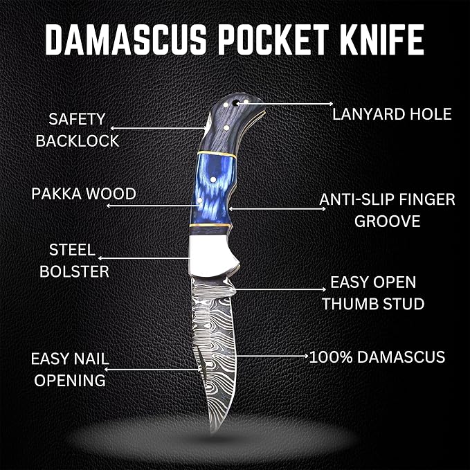 - [๐๐ฎ๐ฑ๐ฎ๐ซ๐ข๐จ๐ฎ๐ฌ ๐๐ซ๐ข๐ฉ]: Handcrafted from exotic Blue pakka wood with steel linings, the ergonomic handle of this mini pocket knife damascus offers unparalleled comfort and control. Adorned with intricate engraving on its handle, this mens pocket knife with sheath transforms into a work of art.