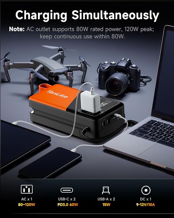 - 【Type-C 60W & 2/3-Prong AC Ports 120V 80W Rated 120W Peak 】Type-C supports 60W PD fast charging, with an AC rated power of 80W and a maximum output of 120W. It can not only charge digital devices like phones, tablets, Switch, and drones, but also power small appliances with 2/3-prong plugs, such as laptops, fans, mini fridges, speakers, and photography lights