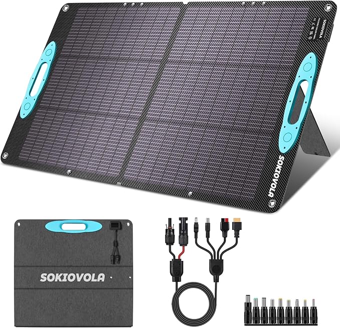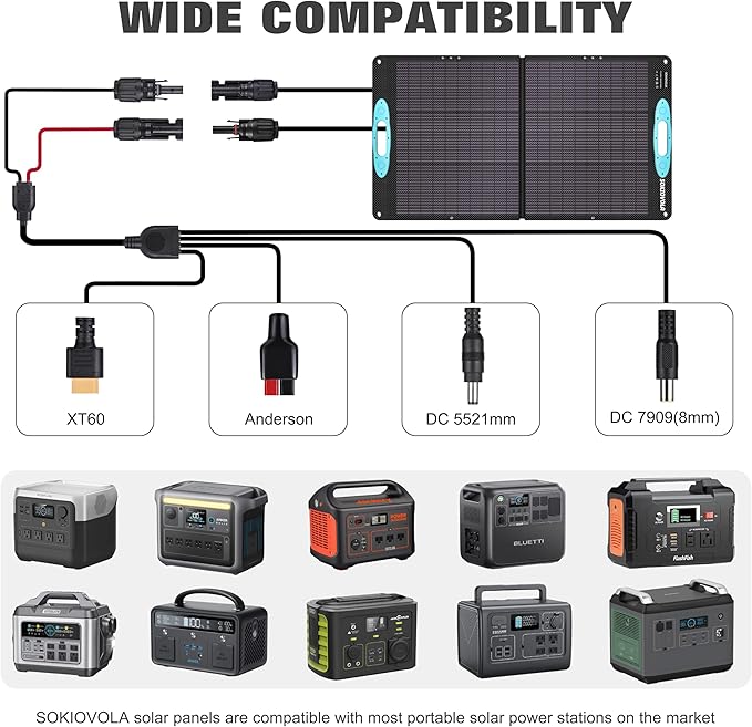 - 【Compatible with Most Solar Generators】SOKIOVOLA 100W Portable Solar Panel comes with MC-4 to 4-in-1 solar panel connectors (XT60,DC5521mm,DC7909 (8mm),Anderson),compatible with most solar generators/portable power stations on the market.Compatible with most solar generators/portable power stations on the market (e.g. Jackery,Ecoflow,Blutti,FlashFish,Goal Zero,Anker, etc.)
