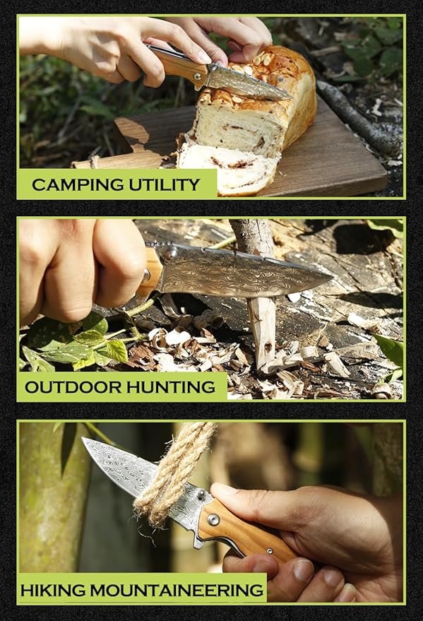 YOUSUNLONG Folding Knife Overall 191mm Pocket Knife - Hammered Damascus Steel Blade - Natural Italian Olive Wood Handle