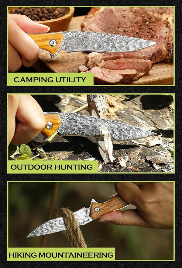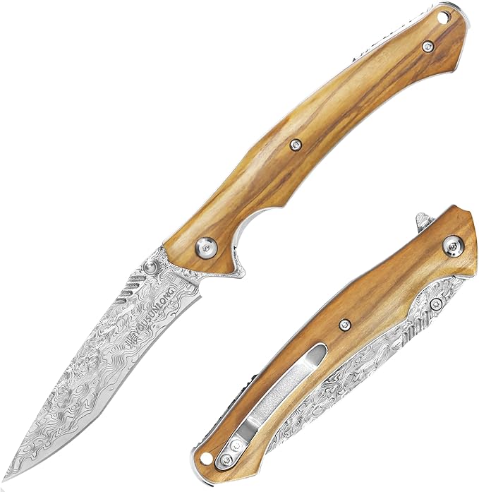 YOUSUNLONG Folding Knives Overall 210mm Pocket Knife - Hammered Damascus Steel Blade - Natural Italian Olive Wood Cover
