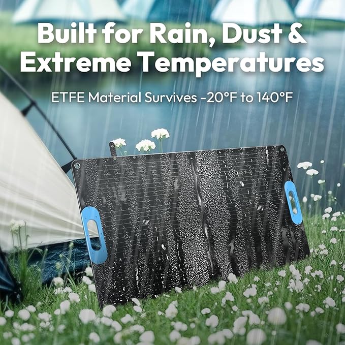 - IP67 Waterproof & Extreme Durability: This monocrystalline solar panel Built with IP67 waterproof, dustproof, and shockproof design using ETFE material; withstands heavy rain, desert heat, and freezing temps (-20°F to 140°F) for all-weather outdoor use.