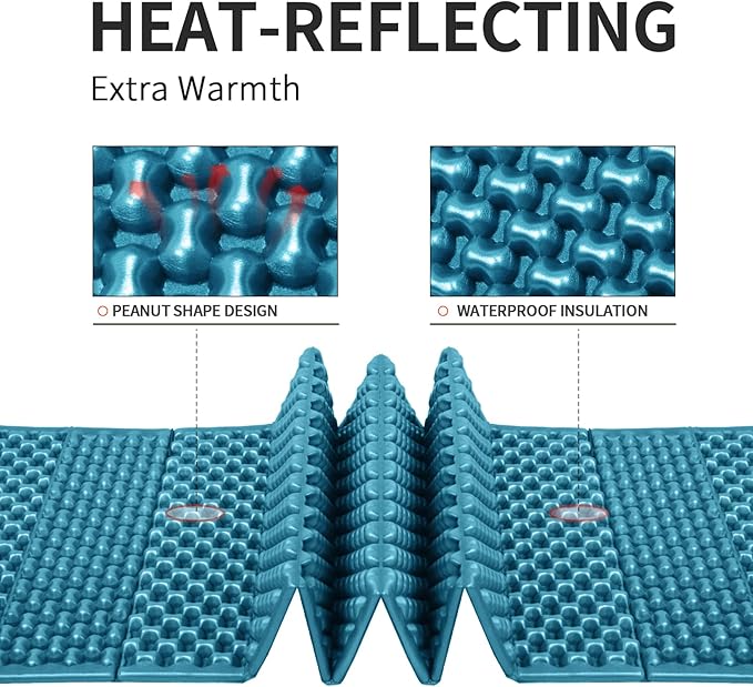 - 【Upgraded Version】The foam sleeping pad is covered with aluminum film, this extremely lightweight coating turns that surface into a very efficient heat reflector, amplifying warmth without the excess weight or bulk added, conventional insulating material is more moistureproof, more durability and easy to clean than the traditional model.