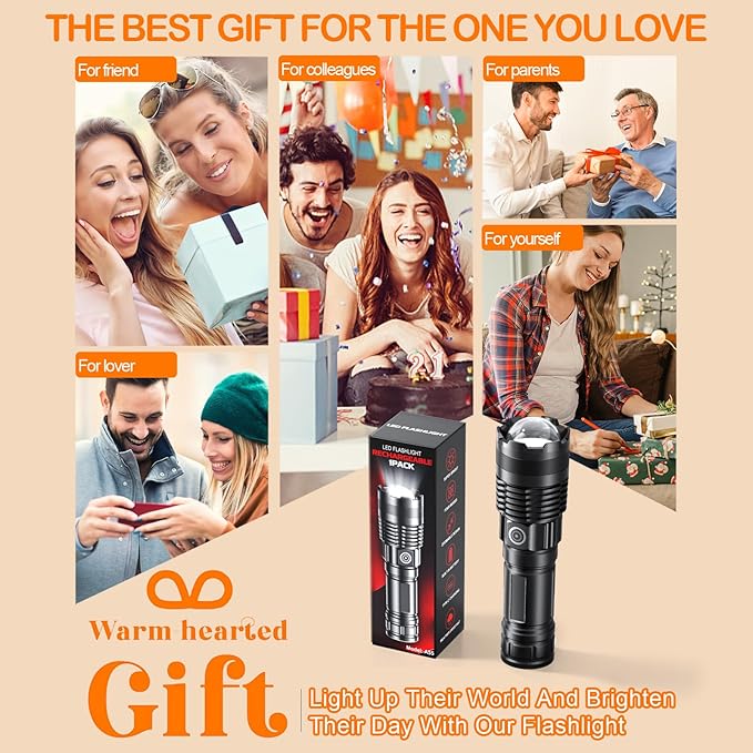 - Wide Use & Decent Customer Services: Perfect for home, power outages, hurricanes, camping trips, hiking, dog walking, fishing and emergency, these led flash lights high lumens rechargeable deliver exceptional lumens to light up your surroundings effectively. Meanwhile, our flashlight is a versatile gift on Christmas, Valentine's Day, Father's Day, Birthday, or Thanksgiving. Our dedicated customer service team is will address any inquiries in 24 hours, ensuring a worry-free shopping experience.