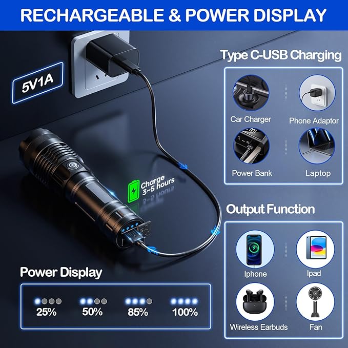 - Rechargeable & Power Display: The powerful flashlightsoffer up to 10 hours of illumination on low mode. Say goodbye to disposable batteries and embrace sustainability with our rechargeable flashlight. The flashlight features a Type-C charging port, allows you to easily connect to USB port, such as laptops for a quick recharge, they can also be use as an emergency power bank when you need. The power indicators on the tail allow you to easily monitor the power status