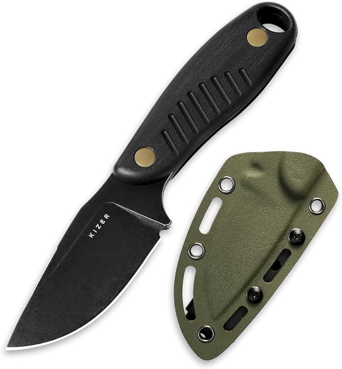 - Drop Point D2 Blade: Kizer edc fixed blade knife with sheath features a D2 steel blade, renowned for its superior hardness and corrosion resistance; With a full flat grind, the blade is extremely sharp, and the drop point design excels at piercing and slicing tasks that demand precision