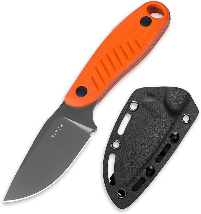 - Drop Point D2 Blade: Kizer hare fixed blade knife with sheath features a D2 steel blade, renowned for its superior hardness and corrosion resistance; With a full flat grind, the blade is extremely sharp, and the drop point design excels at piercing and slicing tasks that demand precision
