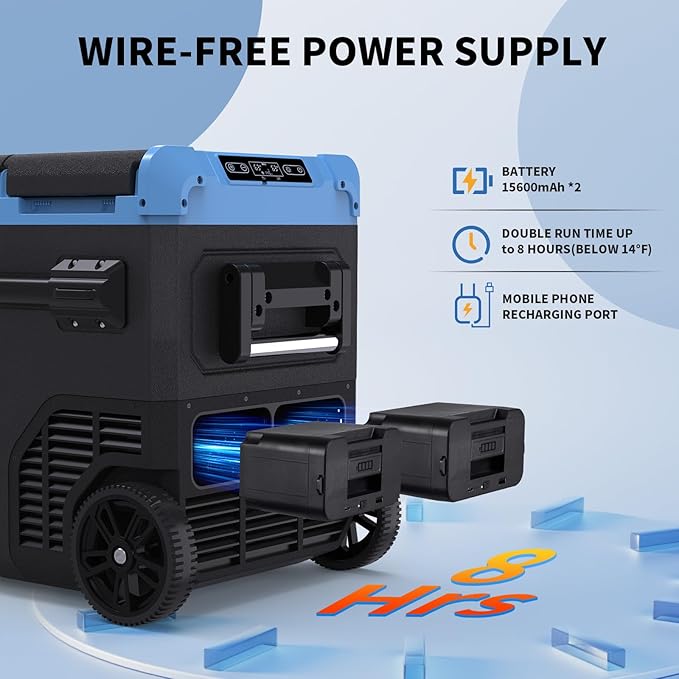 - [Multiple Power Options] Includes 100–240V AC and 12/24V DC cables. Compatible with solar power stations. Dual battery compartments support 6–8 hours of off-grid use. USB ports on batteries charge phones and other devices (batteries not included).