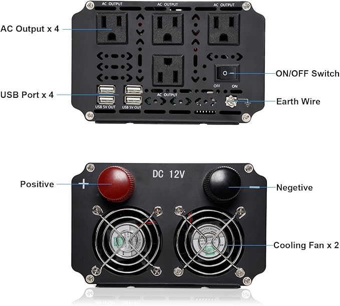 - 【Multiple Usage Scenarios】: You just need to connect the inverter 2500w to the 12V battery through a cable, and you can use 110V AC power anytime and anywhere. Ac appliances or devices for power outages, emergencies, hurricanes, holidays, cars, RVS, trucks, solar power, remote workplaces, or any place that requires AC power, such as TVS, floodlights, laptops, DVDS, players, cell phones, ipads, PSPS, cameras, etc.