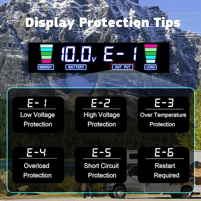- 【Error Code Display】: When the inverter is in an abnormal state, the LCD Display will display the abnormal code. Such as, E-1: Low Voltage Protection, E-2: High Voltage Protection, E-3: Overtemperature Protection, E-4: Overload Protection, E-5: Short Circuit Protection, E-6: Repeated Faults Shutdown, Restart Required.You can troubleshoot the inverter based on these trouble codes.