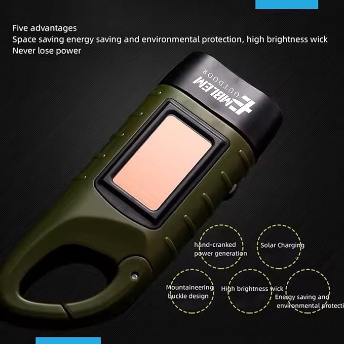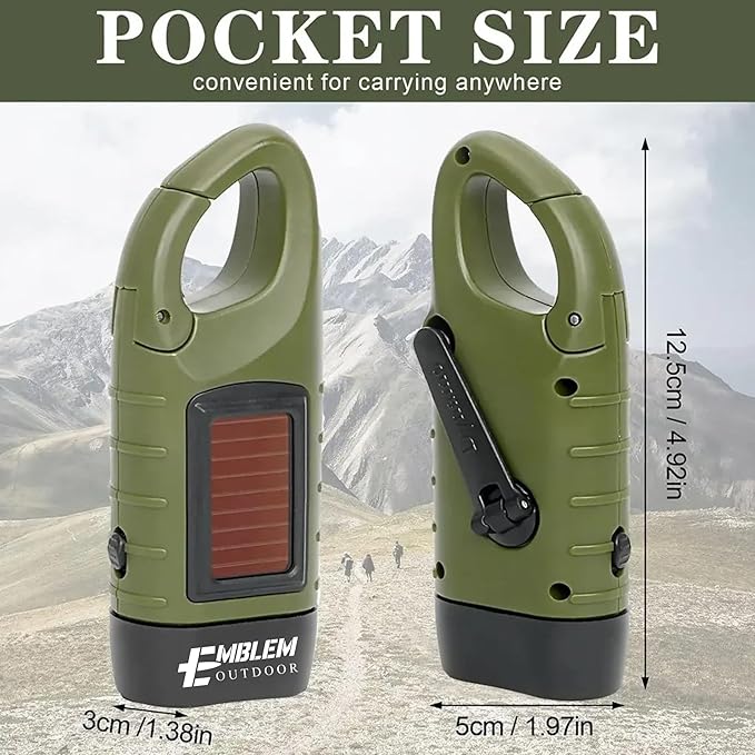 Emblem OD Hand Crank Solar Powered Flashlight, Emergency Rechargeable LED Survival Flashlight with Dynamo Crank and Carbiner Clip. Solar Rechargeable No Batteries Req. Go Bag Supplies. Green - 2 Pack