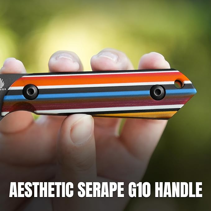 - Aesthetic Serape G10 Handle: The handle is made of multicolored G10, offering a combination of durability and lightweight properties. Camping fixed-blade knife with G10 handle is known for being waterproof and corrosion-resistant, making Harpoon fixed blade knife well-suited for use in harsh environments.