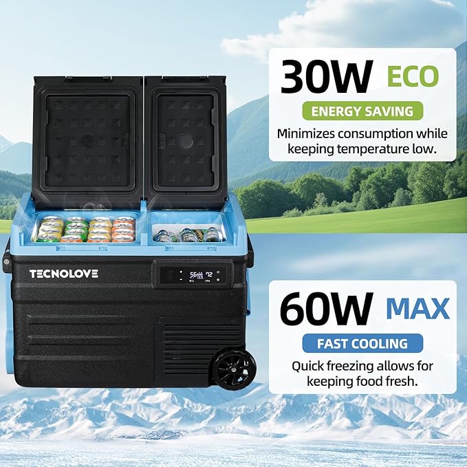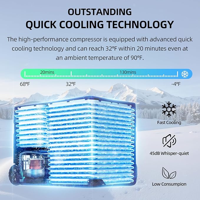- Ultra-Fast & Efficient Cooling Premium compressor and advanced cooling tech reach 32℉ in 15 mins, -4℉ in 50 mins. ECO mode runs under 35W, Max mode stays under 1kWh/day — fast, energy-saving, and reliable cooling.