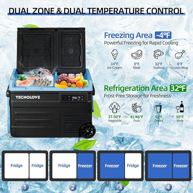 - Dual-Zone Cooling with Independent Control Each zone cools independently from -4℉ to 68℉ — freeze meat while chilling drinks. No flavor transfer or cold loss when opening one compartment. True dual-zone flexibility for organized storage.