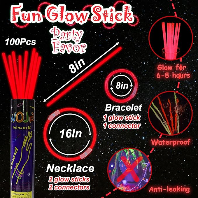 - Illuminate Your Party with Glow Sticks - This set includes 100 pk glow sticks and connectors to create vibrant accessories like bracelets, necklaces, headbands, and belts. Easy to activate by bending and shaking, these glow sticks last for hours, making them perfect for any dark night party