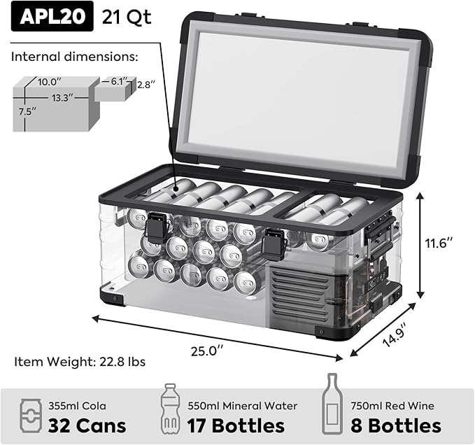 - [Ultra-Light and Portable Design] The ICECO APL20 Portable Freezer weighs only 22.8 lbs with sturdy metal handles. Compact at 25.0"x14.9"x11.6", it maximizes car space for camping or travel.