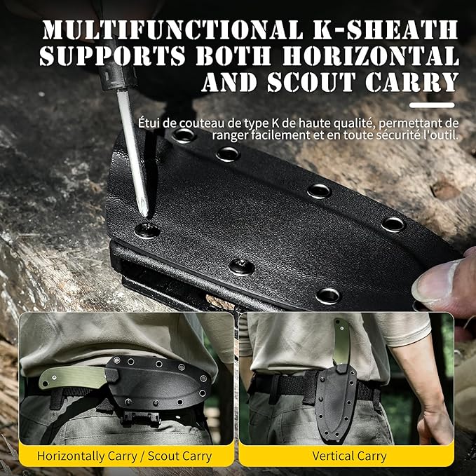 - Versatile Carry Options: The accompanying k-sheath supports multiple carrying methods, including horizontal/scout and vertical carries, providing flexibility and adaptability for different scenarios and preferences.